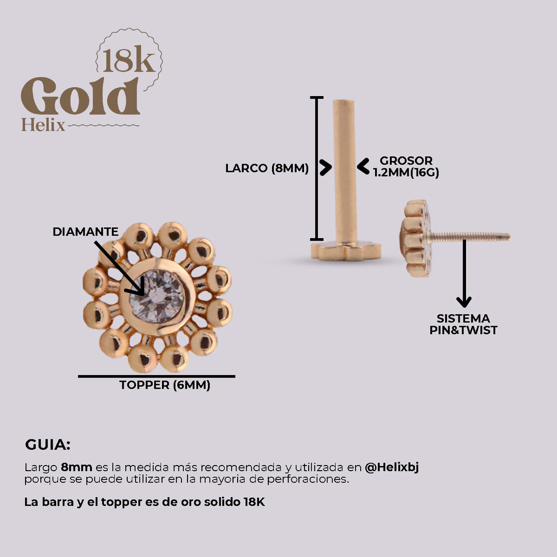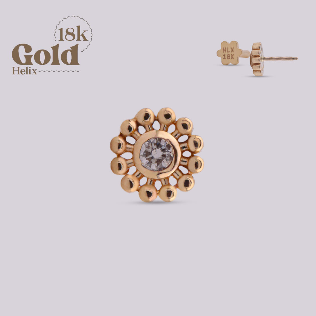 Elevate your look with this radiant 18k gold labret piercing, featuring a sparkling VS quality diamond. The sun design symbolizes energy and vitality, while the diamond adds a touch of timeless elegance and sophistication. This versatile piece can be worn in various piercings, including Helix, Tragus, Lobe, and Flat.
