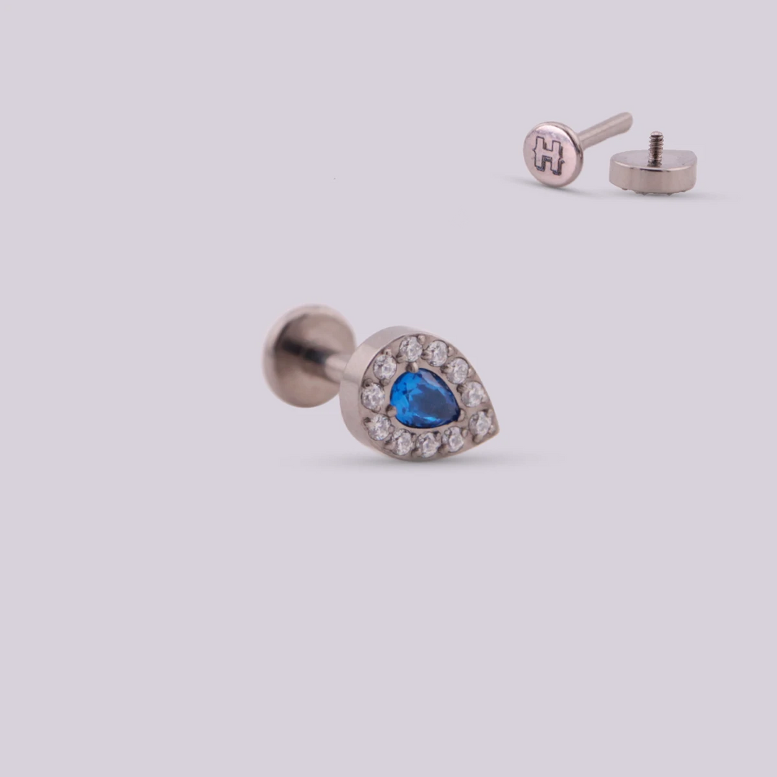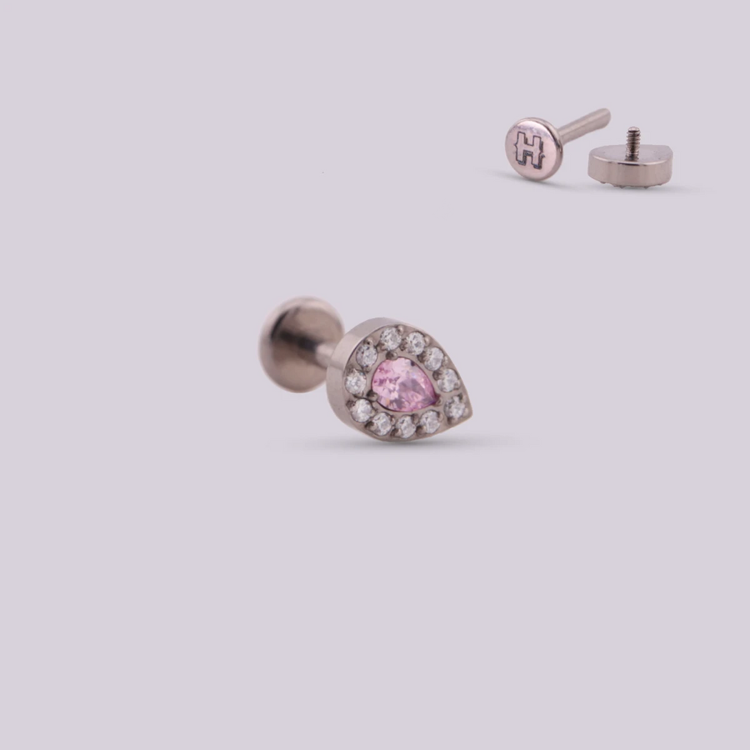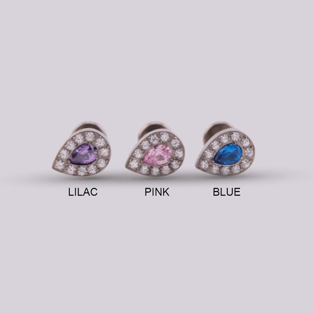 This piercing jewel is shaped like a small and delicate drop, adorned by a larger zircon in the center in pink, lilac and blue tones. Due to its medium size, it can be used in most piercings such as Helix, Tragus, Flat, Contra Helix, Lobe, Upper Lobe and Conch.