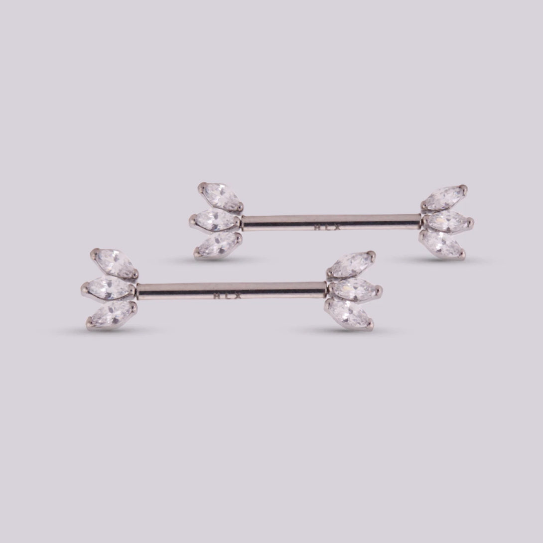 These nipple jewelry are made of Titanium, a high-quality material that is biocompatible with your body, so the healing process will be faster. This piercing has a bar design adorned with lateral figures of three zircons in the shape of delicate hexagonal petals, it is a comfortable, beautiful and very easy to use design due to its push pin opening and closing system.