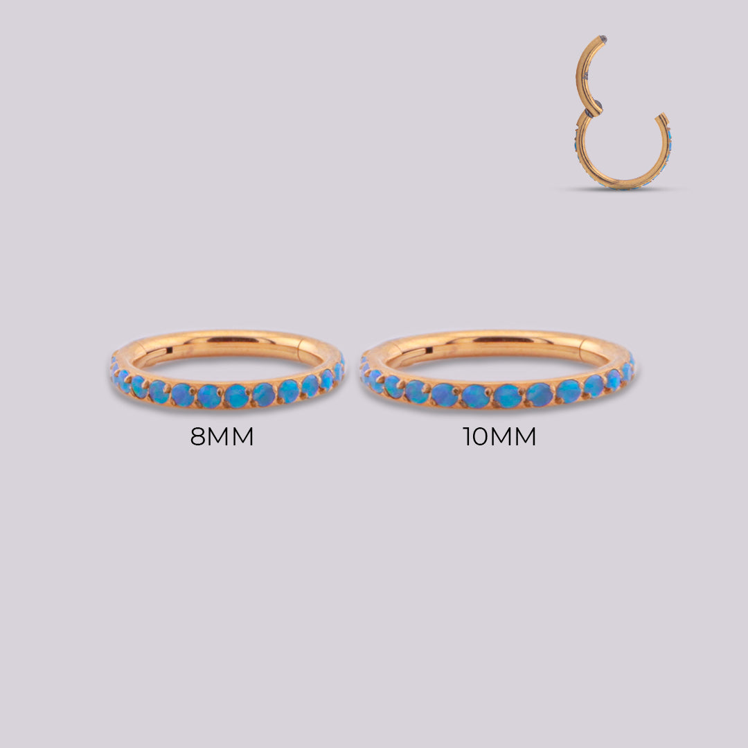 We present to you this hoop that combines shades of blue with gold and makes both colors complement its beauty by being integrated into a single piece of jewelry. Additionally, it allows you to create a sophisticated, feminine and stylish Ear Look. This jewel is made of Titanium with 05 opal inlays and is available in 8mm and 10mm depending on taste and piercing. You can use it in Helix, Conch, Lobe, Upper Lobe.