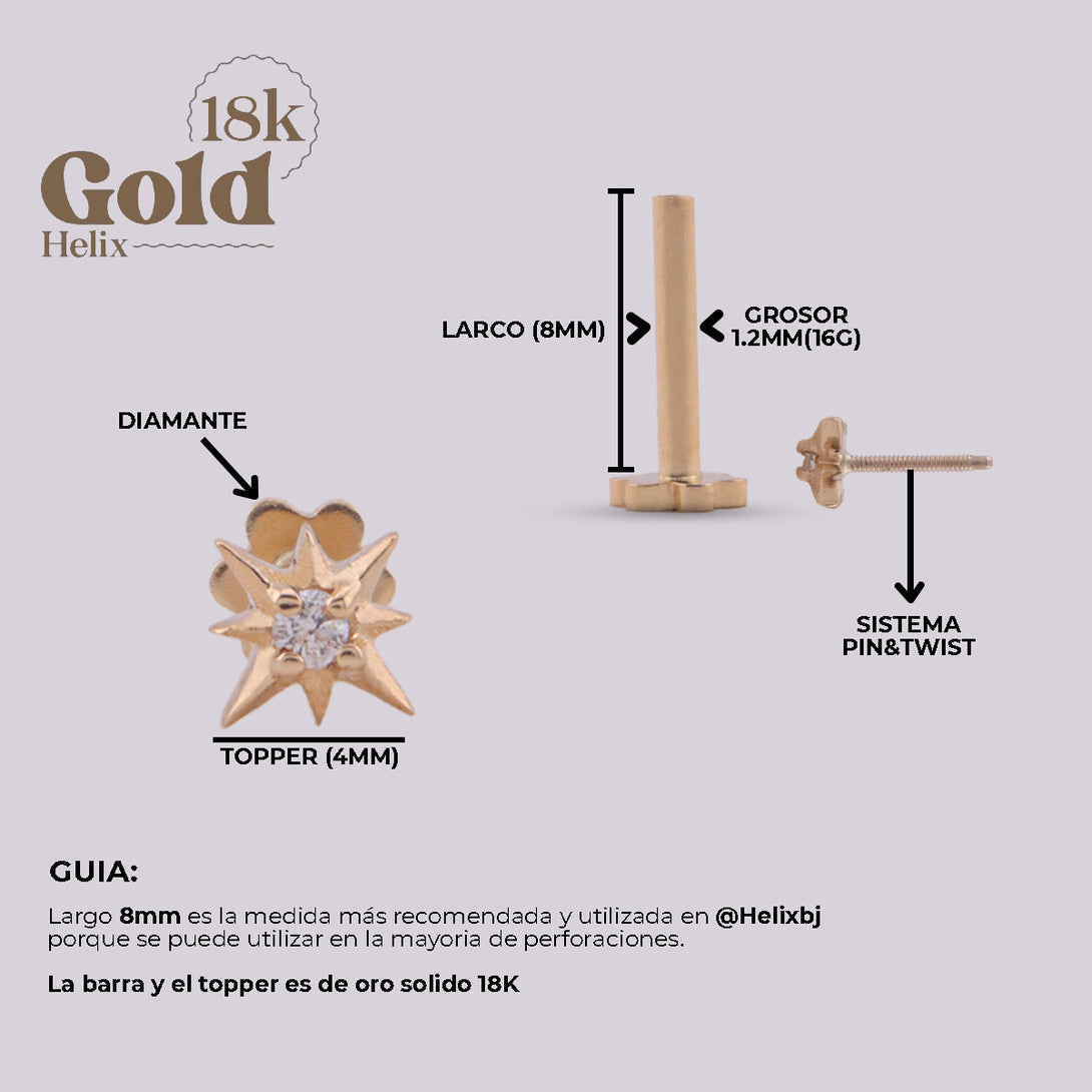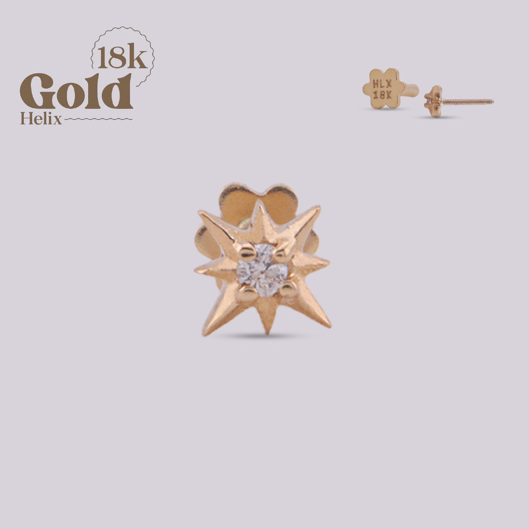 Illuminate your style with this captivating 18k gold labret piercing, featuring an 8-point star design and a radiant diamond center. This celestial piece symbolizes beauty and harmony, while the sparkling diamond adds a touch of timeless elegance and sophistication. Its versatility allows you to wear it in various piercings, including Helix, Tragus, Lobe, and Flat.