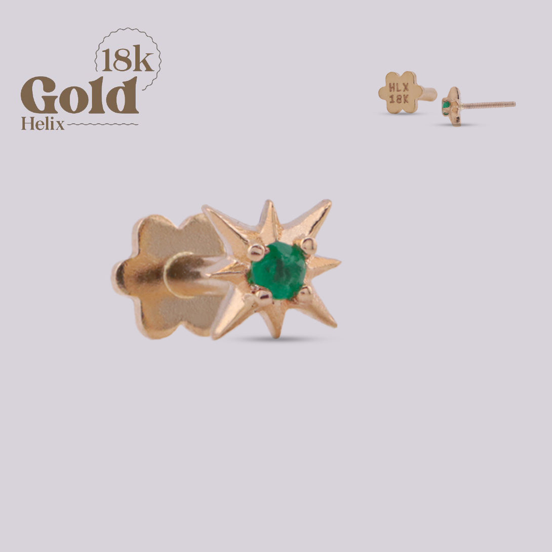Elevate your style with this celestial 18k gold labret piercing, featuring an 8-point star design and a radiant emerald center. This captivating piece symbolizes beauty and harmony, while the vibrant emerald adds a touch of elegance and sophistication. Its versatility allows you to wear it in various piercings, including Helix, Tragus, Lobe, and Flat.