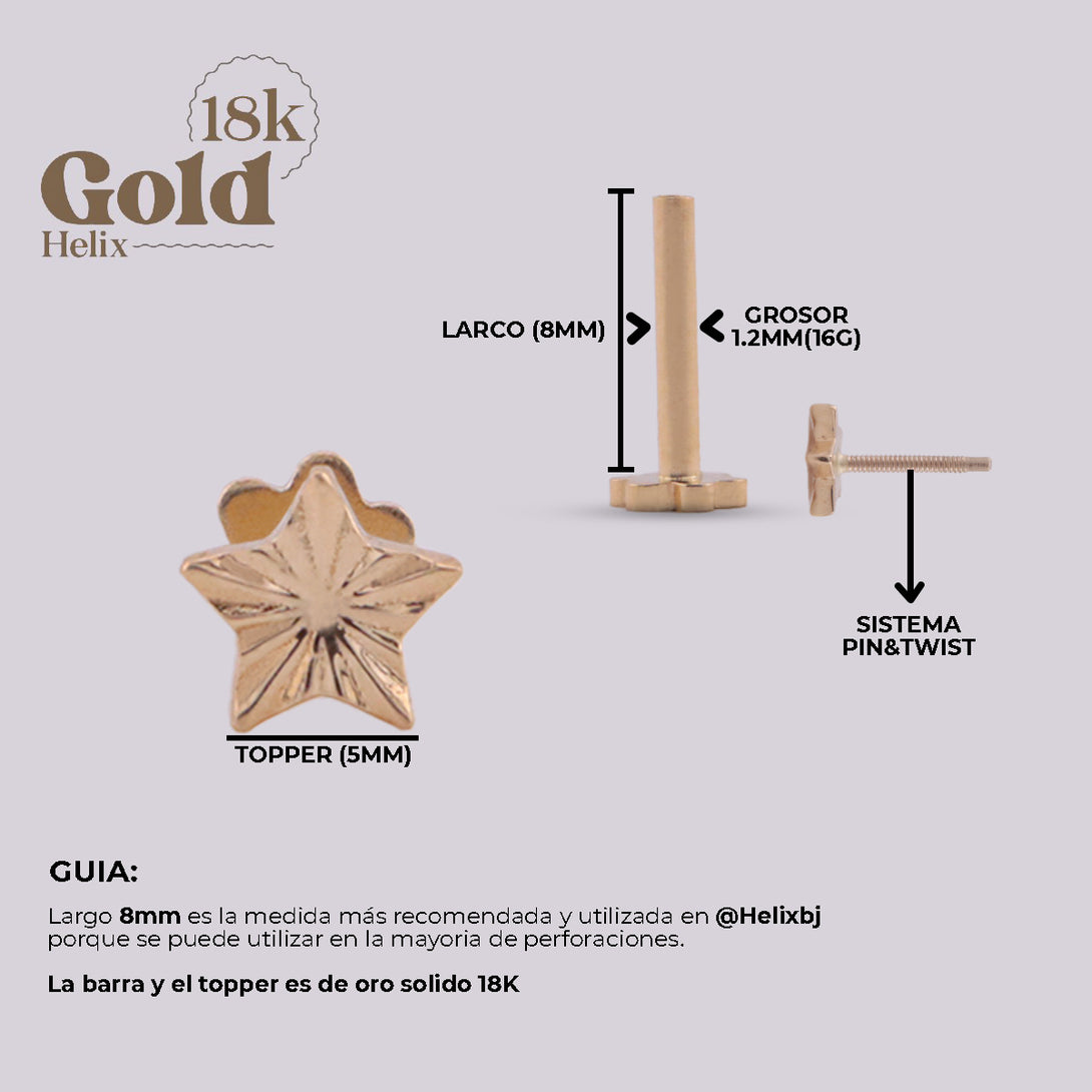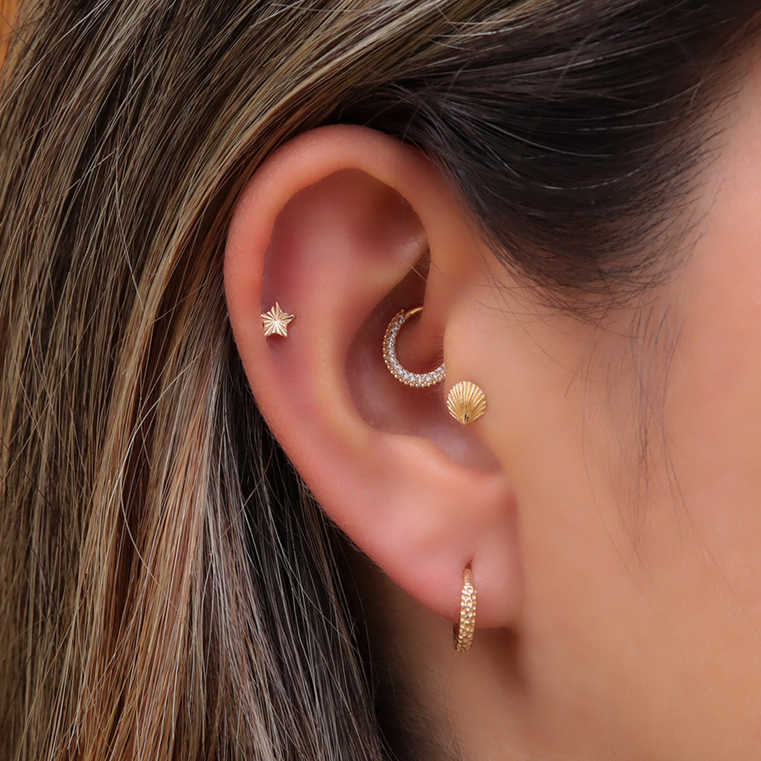 Illuminate your look with this exquisite 18k gold star labret piercing. Its delicate design with fine engravings creates a unique texture that captures the light from every angle. This captivating piece adds a touch of celestial charm to any piercing.